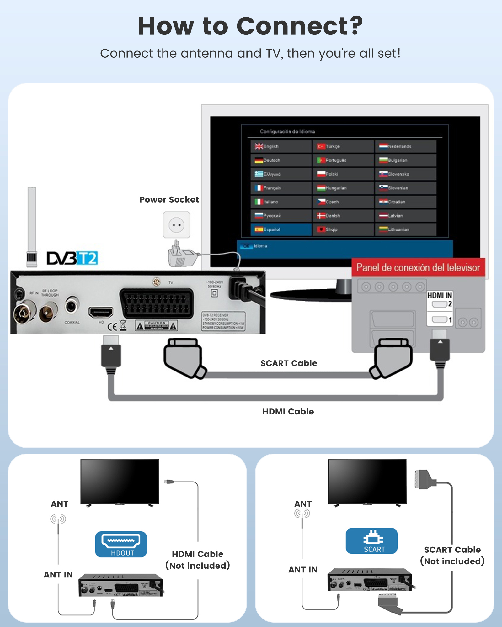 8. Supports HDMI output, scart coaxial, RF in and output