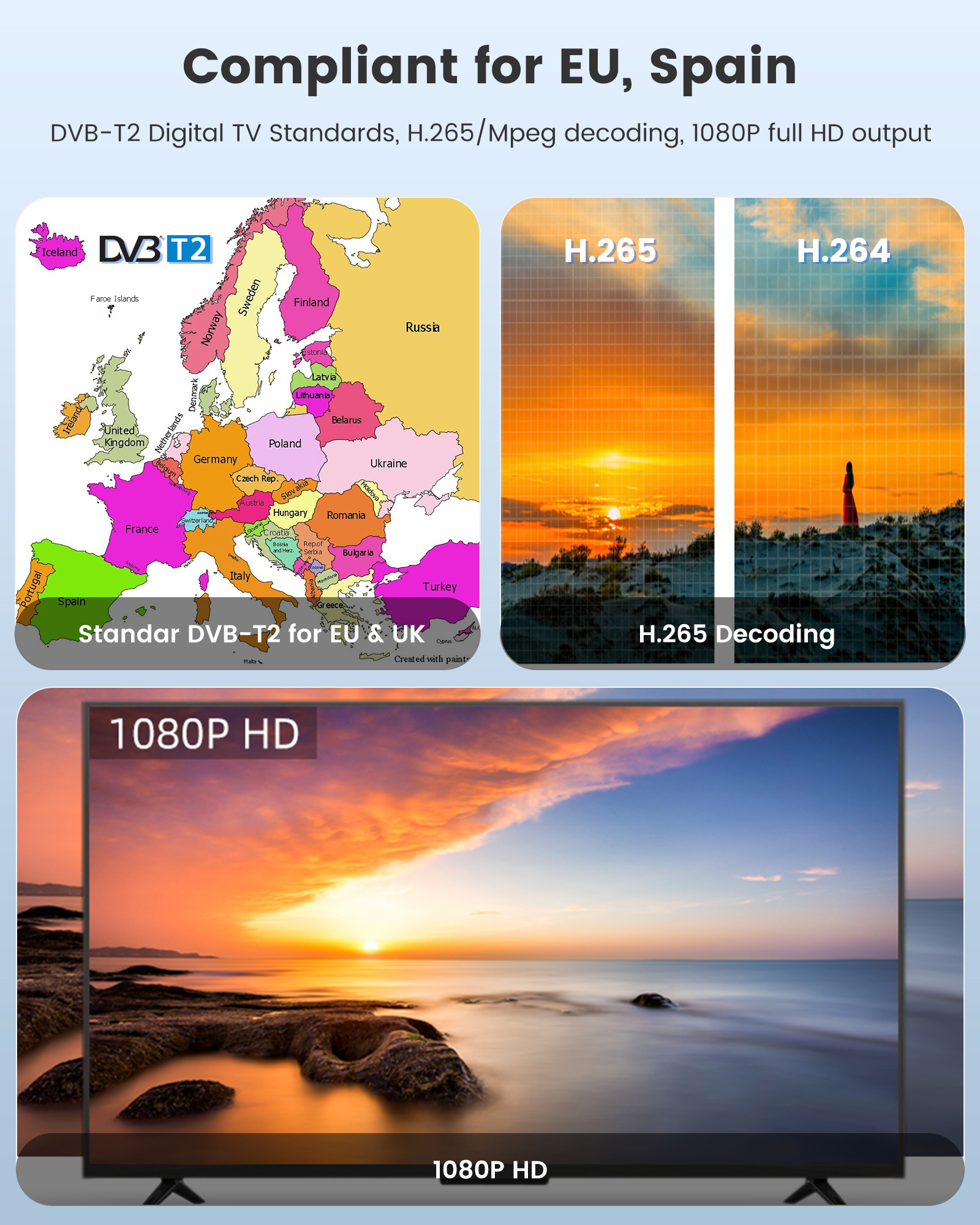 1.DVB-T2/DVB-T/DVBC compatible, support h.264 and h.265 Free to air channels